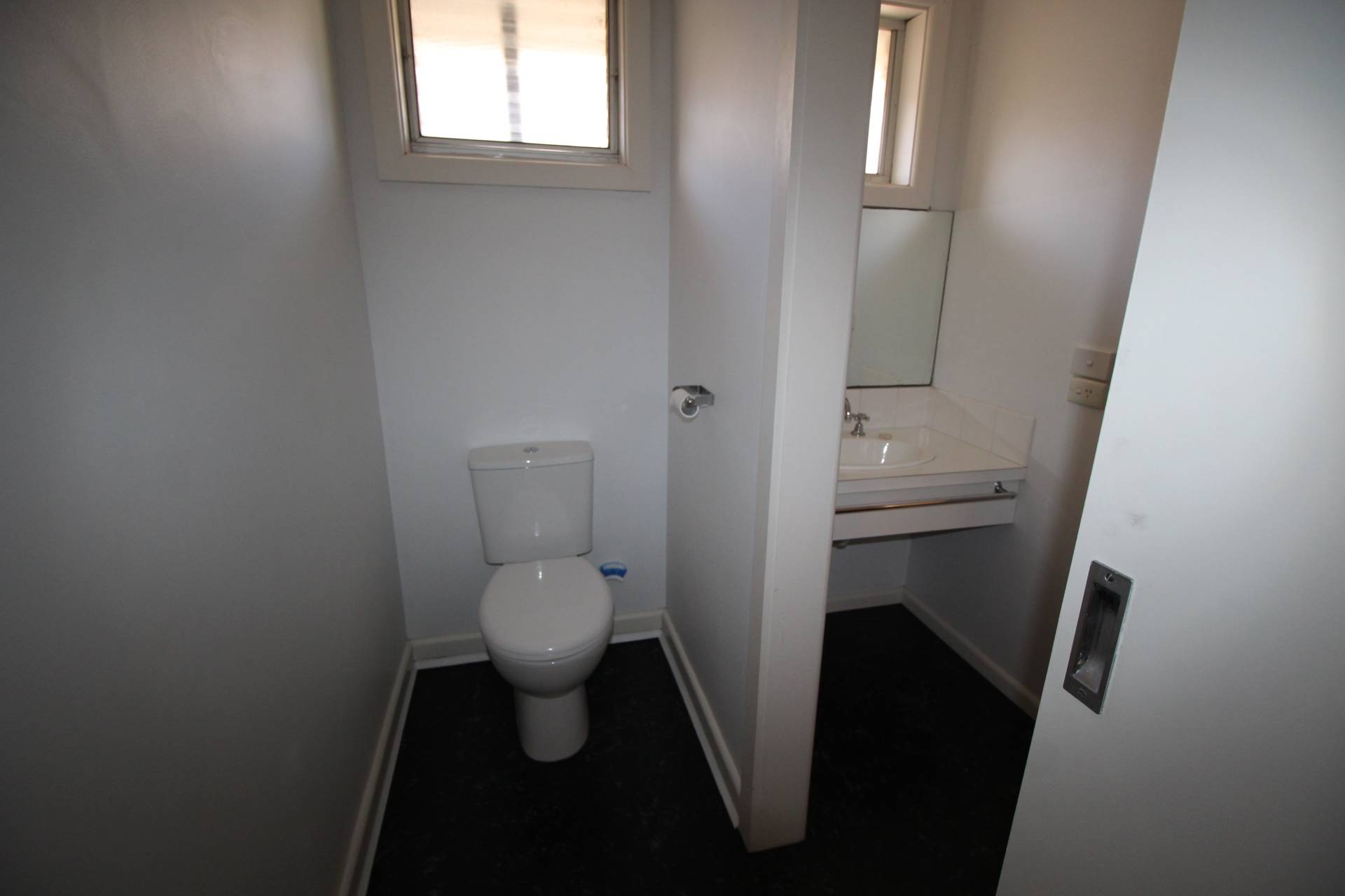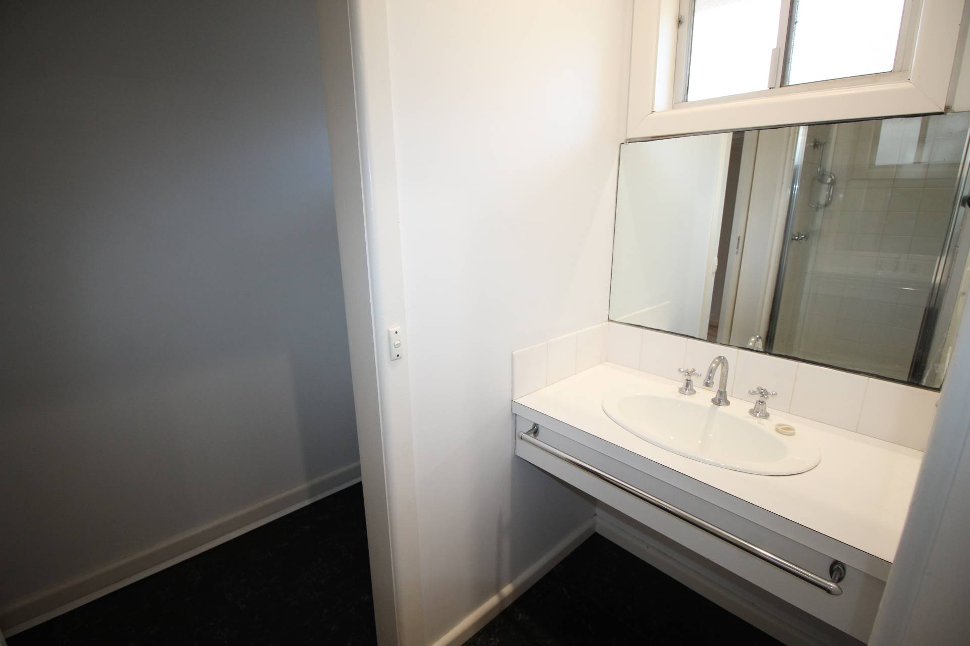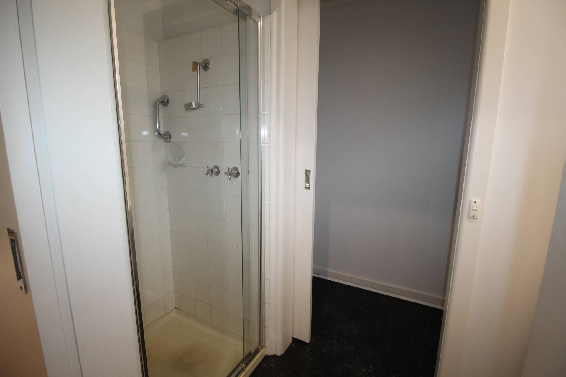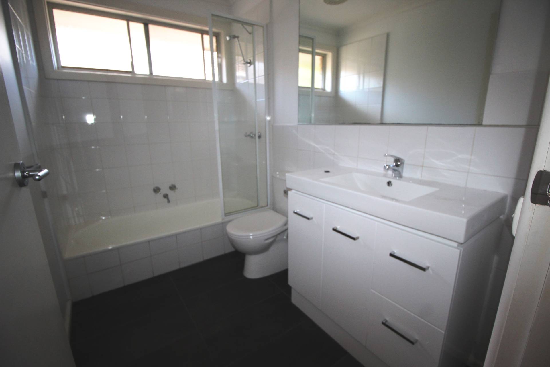 A modern fresh bathroom with shower over bath and toilet.  Laundry with built in cupboard.