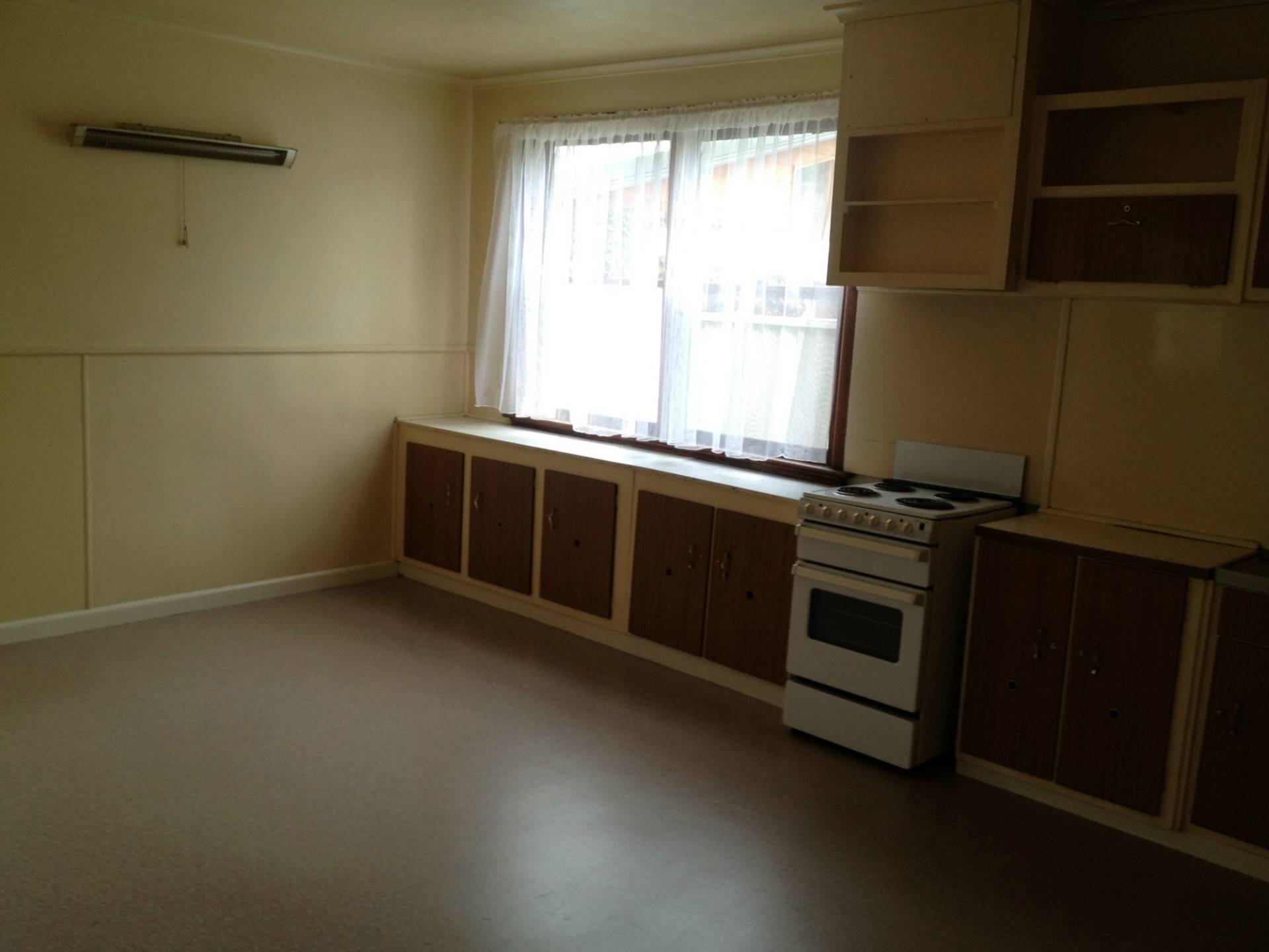 Large kitchen with electric upright oven and ample cupboard space.