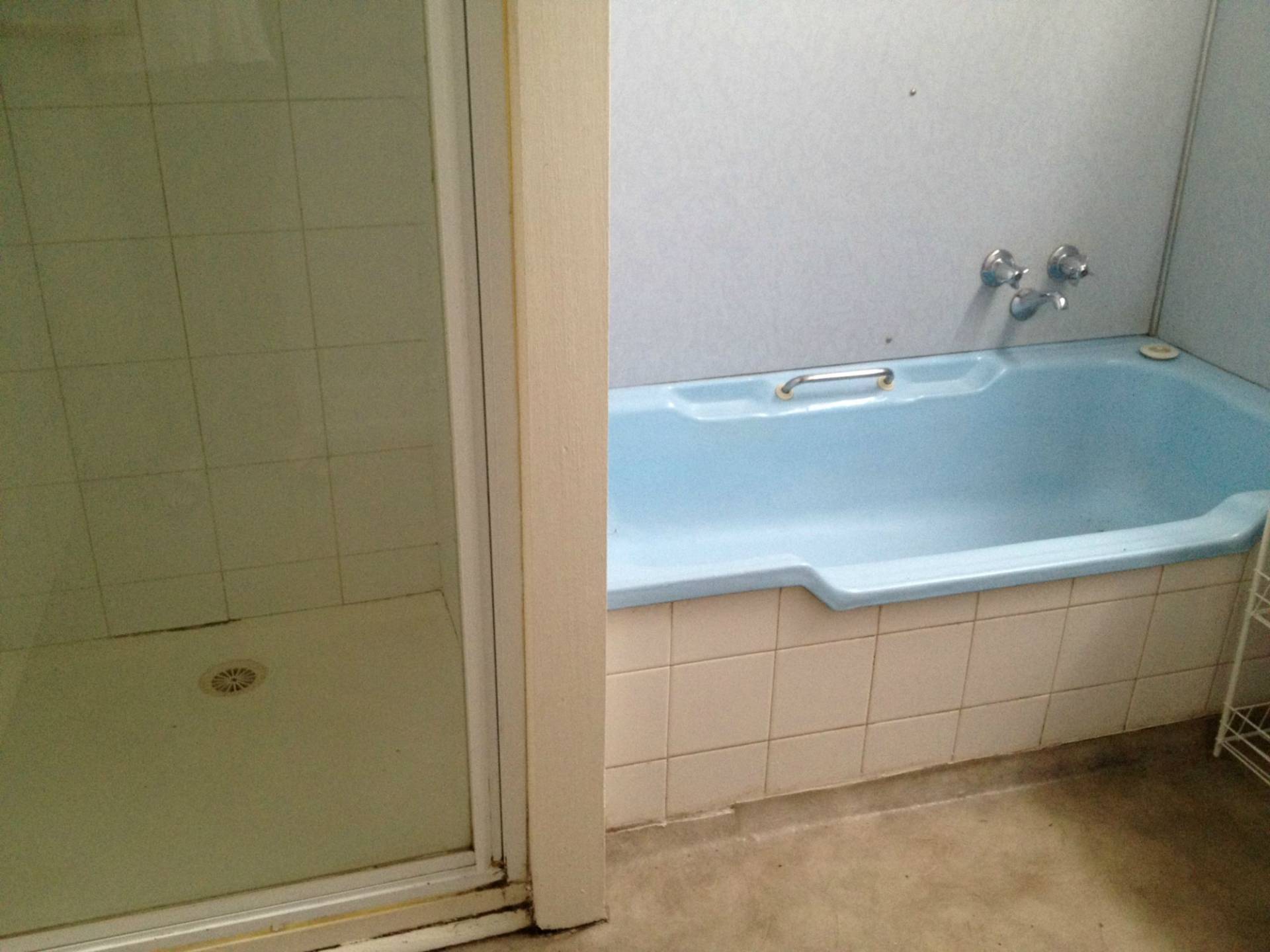 Bathroom with toilet, bath and shower.