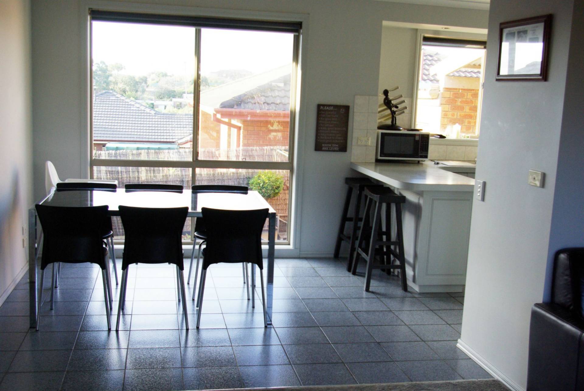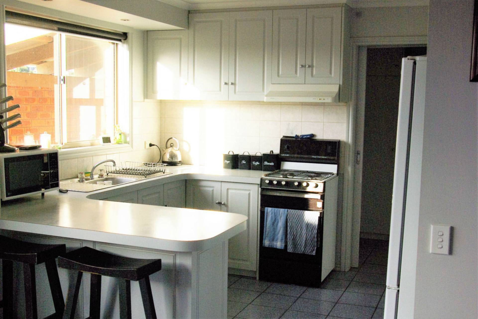 The kitchen has ample cupboards and gas cooking, the light filled tiled dining area leads through to the spacious lounge.